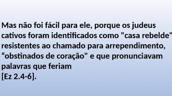 - Mas não foi fácil para ele, porque os judeus cativos foram identificados como "casa rebelde" resistentes ao chamado para arrependimento, “obstinados de coração" e que pronunciavam palavras que feriam [Ez 2.4-6].