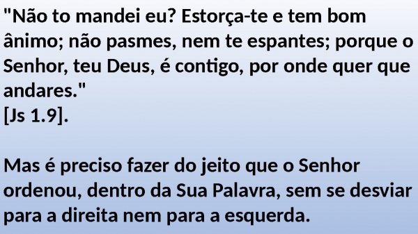 - "Não to mandei eu? Estorça-te e tem bom ânimo; não pasmes, nem te espantes; porque o Senhor, teu Deus, é contigo, por onde quer que andares." [Js 1.9]. Mas é preciso fazer do jeito que o Senhor ordenou, dentro da Sua Palavra, sem se desviar para a direita nem para a esquerda.
