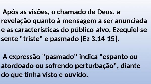 - Após as visões, o chamado de Deus, a revelação quanto à mensagem a ser anunciada e as características do público-alvo, Ezequiel se sente "triste" e pasmado [Ez 3.14-15]. A expressão "pasmado" indica "espanto ou atordoado ou sofrendo perturbação", diante do que tinha visto e ouvido.