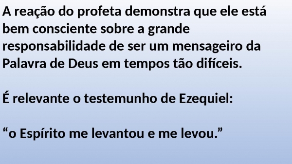 - A reação do profeta demonstra que ele está bem consciente sobre a granderesponsabilidade de ser um mensageiro da Palavra de Deus em tempos tão difíceis. É relevante o testemunho de Ezequiel:“o Espírito me levantou e me levou.”
