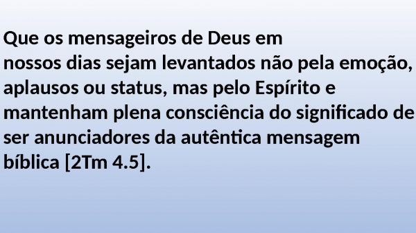 - Que os mensageiros de Deus em nossos dias sejam levantados não pela emoção, aplausos ou status, mas pelo Espírito e mantenham plena consciência do significado de ser anunciadores da autêntica mensagem bíblica [2Tm 4.5].
