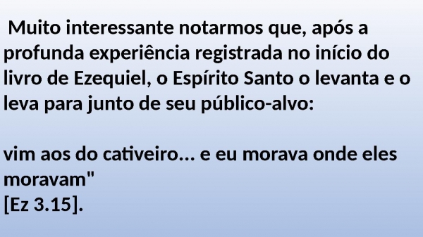 - Muito interessante notarmos que, após a profunda experiência registrada no início do livro de Ezequiel, o Espírito Santo o levanta e o leva para junto de seu público-alvo: vim aos do cativeiro... e eu morava onde eles moravam" [Ez 3.15].