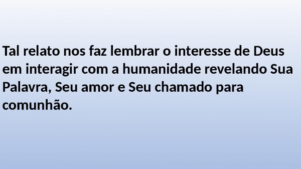 - Tal relato nos faz lembrar o interesse de Deus em interagir com a humanidade revelando Sua Palavra, Seu amor e Seu chamado para comunhão.