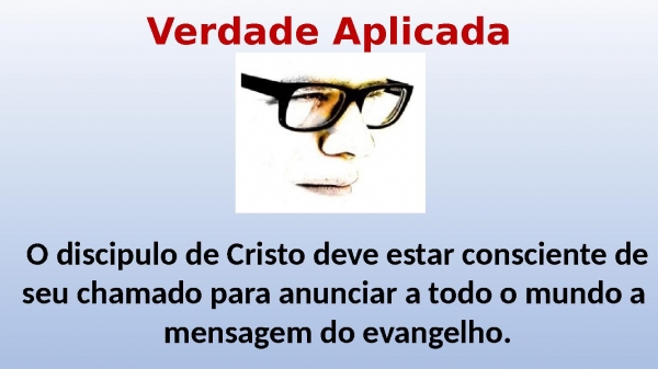 - Verdade AplicadaO discipulo de Cristo deve estar consciente de seu chamado para anunciar a todo o mundo a mensagem do evangelho.