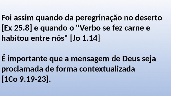 - Foi assim quando da peregrinação no deserto [Ex 25.8] e quando o "Verbo se fez carne e habitou entre nós" [Jo 1.14] É importante que a mensagem de Deus seja proclamada de forma contextualizada [1Co 9.19-23].
