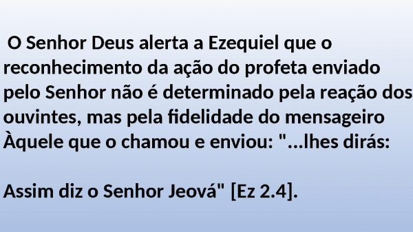 - O Senhor Deus alerta a Ezequiel que o reconhecimento da ação do profeta enviado pelo Senhor não é determinado pela reação dos ouvintes, mas pela fidelidade do mensageiro Àquele que o chamou e enviou: "...lhes dirás: Assim diz o Senhor Jeová" [Ez 2.4].
