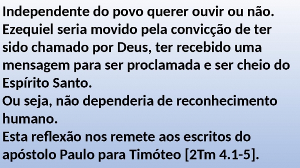 - Independente do povo querer ouvir ou não. Ezequiel seria movido pela convicção de ter sido chamado por Deus, ter recebido uma mensagem para ser proclamada e ser cheio do Espírito Santo. Ou seja, não dependeria de reconhecimento humano. Esta reflexão nos remete aos escritos do apóstolo Paulo para Timóteo [2Tm 4.1-5].