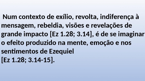 - Num contexto de exílio, revolta, indiferença à mensagem, rebeldia, visões e revelações de grande impacto [Ez 1.28; 3.14], é de se imaginar o efeito produzido na mente, emoção e nos sentimentos de Ezequiel [Ez 1.28; 3.14-15].