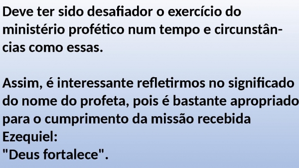 - Deve ter sido desafiador o exercício do ministério profético num tempo e circunstân-cias como essas. Assim, é interessante refletirmos no significado do nome do profeta, pois é bastante apropriado para o cumprimento da missão recebida Ezequiel: "Deus fortalece".