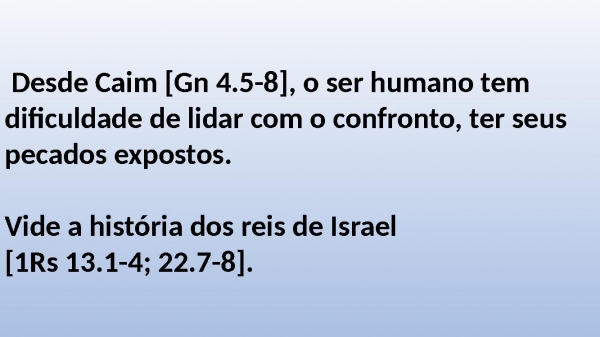 - Desde Caim [Gn 4.5-8], o ser humano tem dificuldade de lidar com o confronto, ter seus pecados expostos. Vide a história dos reis de Israel [1Rs 13.1-4; 22.7-8].