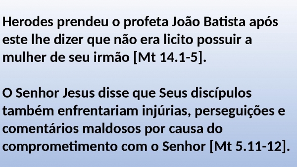 - Herodes prendeu o profeta João Batista após este lhe dizer que não era licito possuir a mulher de seu irmão [Mt 14.1-5]. O Senhor Jesus disse que Seus discípulos também enfrentariam injúrias, perseguições e comentários maldosos por causa do comprometimento com o Senhor [Mt 5.11-12].