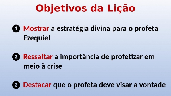 - Objetivos da Lição❶ Mostrar a estratégia divina para o profeta Ezequiel❷ Ressaltar a importância de profetizar em meio à crise❸ Destacar que o profeta deve visar a vontade de Deus
