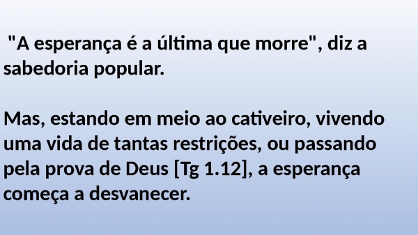 - "A esperança é a última que morre", diz a sabedoria popular.Mas, estando em meio ao cativeiro, vivendo uma vida de tantas restrições, ou passando pela prova de Deus [Tg 1.12], a esperança começa a desvanecer.