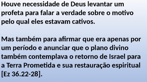 - Houve necessidade de Deus levantar um profeta para falar a verdade sobre o motivo pelo qual eles estavam cativos. Mas também para afirmar que era apenas por um período e anunciar que o plano divino também contemplava o retorno de Israel para a Terra Prometida e sua restauração espiritual [Ez 36.22-28].