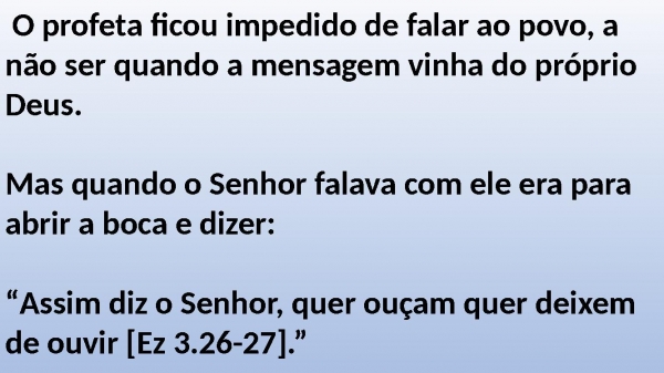 - O profeta ficou impedido de falar ao povo, a não ser quando a mensagem vinha do próprio Deus. Mas quando o Senhor falava com ele era para abrir a boca e dizer: “Assim diz o Senhor, quer ouçam quer deixem de ouvir [Ez 3.26-27].”