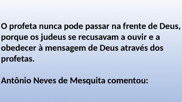 - O profeta nunca pode passar na frente de Deus, porque os judeus se recusavam a ouvir e a obedecer à mensagem de Deus através dos profetas. Antônio Neves de Mesquita comentou: