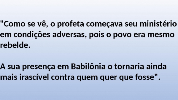 - "Como se vê, o profeta começava seu ministério em condições adversas, pois o povo era mesmo rebelde. A sua presença em Babilônia o tornaria ainda mais irascível contra quem quer que fosse".