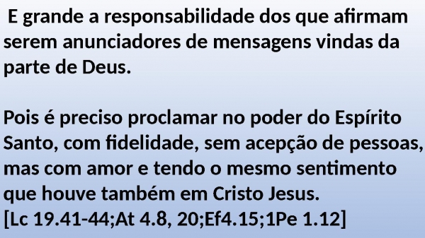 - E grande a responsabilidade dos que afirmam serem anunciadores de mensagens vindas da parte de Deus.Pois é preciso proclamar no poder do Espírito Santo, com fidelidade, sem acepção de pessoas, mas com amor e tendo o mesmo sentimento que houve também em Cristo Jesus.[Lc 19.41-44;At 4.8, 20;Ef4.15;1Pe 1.12]