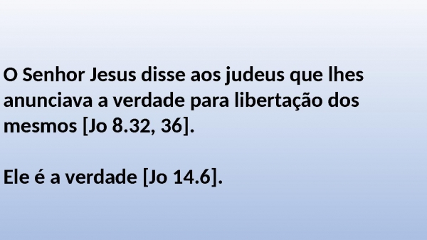 - O Senhor Jesus disse aos judeus que lhes anunciava a verdade para libertação dos mesmos [Jo 8.32, 36]. Ele é a verdade [Jo 14.6].