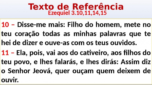 - Texto de Referência Ezequiel 3.10,11,14,1510 – Disse-me mais: Filho do homem, mete no teu coração todas as minhas palavras que te hei de dizer e ouve-as com os teus ouvidos.11 – Ela, pois, vai aos do cativeiro, aos filhos do teu povo, e lhes falarás, e lhes dirás: Assim diz o Senhor Jeová, quer ouçam quem deixem de ouvir.
