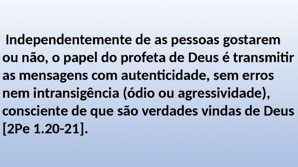 - Independentemente de as pessoas gostarem ou não, o papel do profeta de Deus é transmitir as mensagens com autenticidade, sem erros nem intransigência (ódio ou agressividade), consciente de que são verdades vindas de Deus [2Pe 1.20-21].