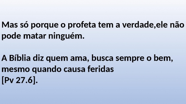 - Mas só porque o profeta tem a verdade,ele não pode matar ninguém. A Bíblia diz quem ama, busca sempre o bem, mesmo quando causa feridas [Pv 27.6].