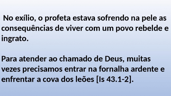 - No exílio, o profeta estava sofrendo na pele as consequências de viver com um povo rebelde e ingrato.Para atender ao chamado de Deus, muitas vezes precisamos entrar na fornalha ardente e enfrentar a cova dos leões [Is 43.1-2].