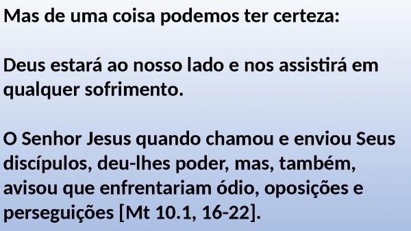 - Mas de uma coisa podemos ter certeza: Deus estará ao nosso lado e nos assistirá em qualquer sofrimento. O Senhor Jesus quando chamou e enviou Seus discípulos, deu-lhes poder, mas, também, avisou que enfrentariam ódio, oposições e perseguições [Mt 10.1, 16-22].