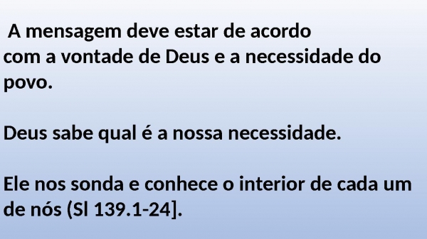 - A mensagem deve estar de acordo com a vontade de Deus e a necessidade do povo.Deus sabe qual é a nossa necessidade. Ele nos sonda e conhece o interior de cada um de nós (Sl 139.1-24].