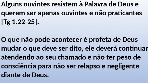 - Alguns ouvintes resistem à Palavra de Deus e querem ser apenas ouvintes e não praticantes [Tg 1.22-25]. O que não pode acontecer é profeta de Deus mudar o que deve ser dito, ele deverá continuar atendendo ao seu chamado e não ter peso de consciência para não ser relapso e negligente diante de Deus.