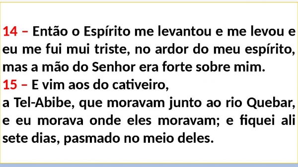 - 14 – Então o Espírito me levantou e me levou e eu me fui mui triste, no ardor do meu espírito, mas a mão do Senhor era forte sobre mim.15 – E vim aos do cativeiro, a Tel-Abibe, que moravam junto ao rio Quebar, e eu morava onde eles moravam; e fiquei ali sete dias, pasmado no meio deles.