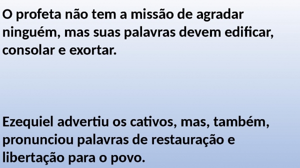 - O profeta não tem a missão de agradar ninguém, mas suas palavras devem edificar, consolar e exortar. Ezequiel advertiu os cativos, mas, também, pronunciou palavras de restauração e libertação para o povo.