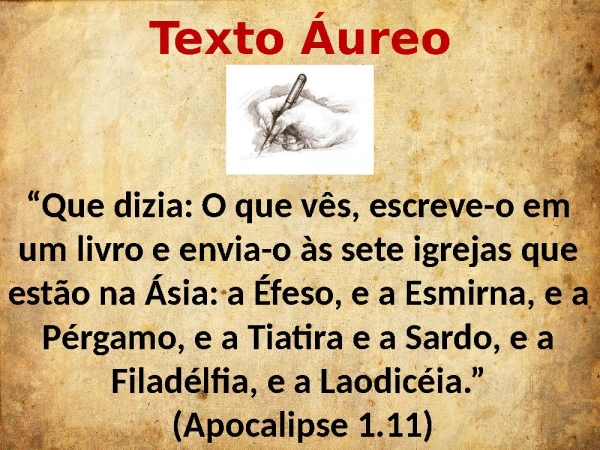 - Texto Áureo“Que dizia: O que vês, escreve-o em um livro e envia-o às sete igrejas que estão na Ásia: a Éfeso, e a Esmirna, e a Pérgamo, e a Tiatira e a Sardo, e a Filadélfia, e a Laodicéia.” (Apocalipse 1.11)