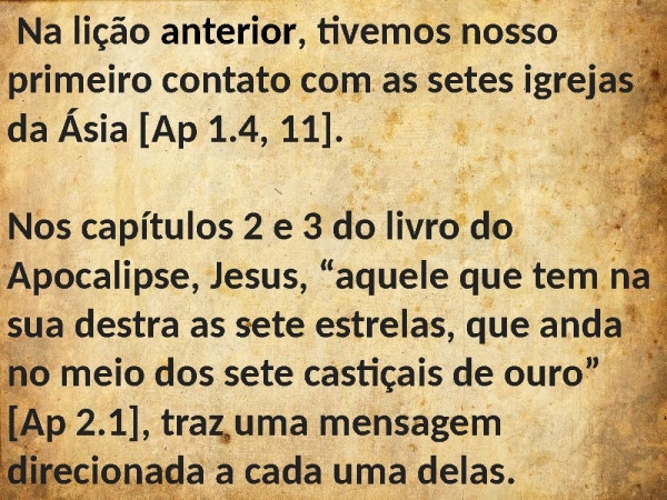 - Na lição anterior, tivemos nosso primeiro contato com as setes igrejas da Ásia [Ap 1.4, 11]. Nos capítulos 2 e 3 do livro do Apocalipse, Jesus, “aquele que tem na sua destra as sete estrelas, que anda no meio dos sete castiçais de ouro” [Ap 2.1], traz uma mensagem direcionada a cada uma delas.