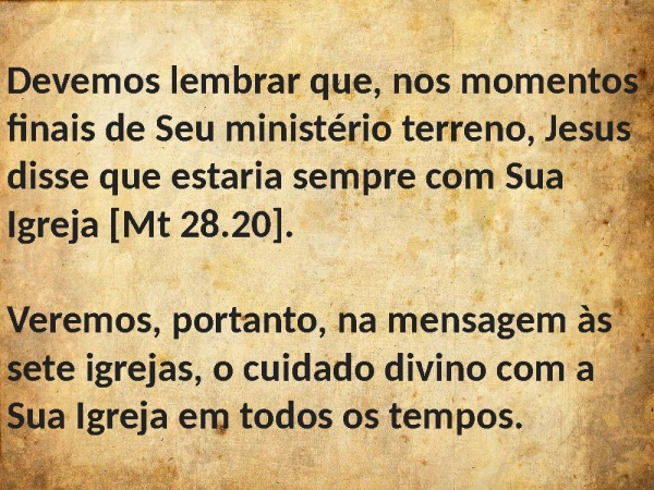 - Devemos lembrar que, nos momentos finais de Seu ministério terreno, Jesus disse que estaria sempre com Sua Igreja [Mt 28.20]. Veremos, portanto, na mensagem às sete igrejas, o cuidado divino com a Sua Igreja em todos os tempos.