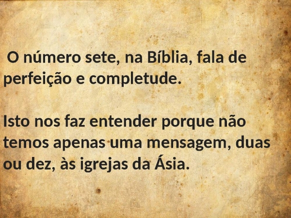 - O número sete, na Bíblia, fala de perfeição e completude.Isto nos faz entender porque não temos apenas uma mensagem, duas ou dez, às igrejas da Ásia.