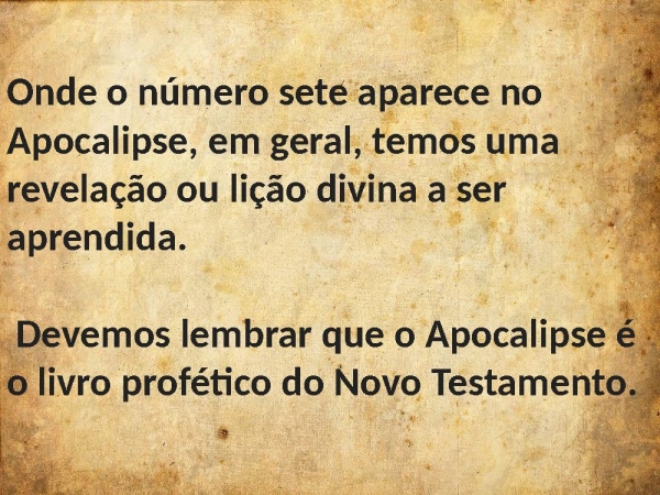 - Onde o número sete aparece no Apocalipse, em geral, temos uma revelação ou lição divina a ser aprendida. Devemos lembrar que o Apocalipse é o livro profético do Novo Testamento.