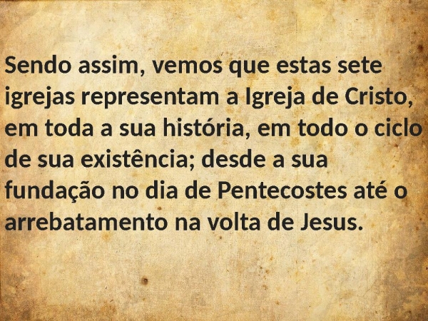 - Sendo assim, vemos que estas sete igrejas representam a Igreja de Cristo, em toda a sua história, em todo o ciclo de sua existência; desde a sua fundação no dia de Pentecostes até o arrebatamento na volta de Jesus.