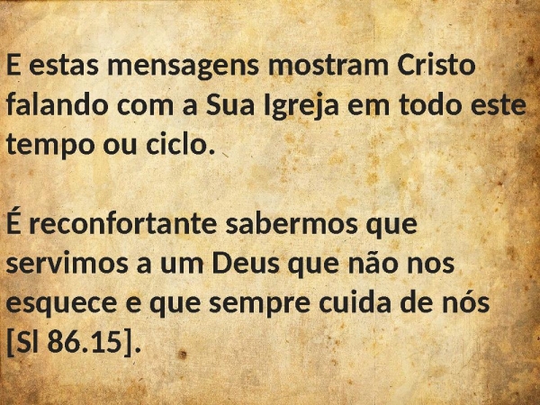 - E estas mensagens mostram Cristo falando com a Sua Igreja em todo este tempo ou ciclo. É reconfortante sabermos que servimos a um Deus que não nos esquece e que sempre cuida de nós [Sl 86.15].