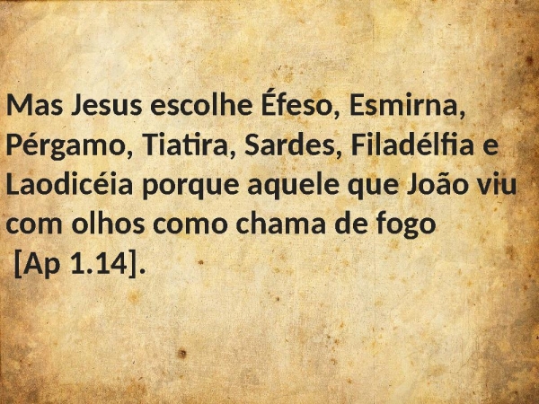 - Mas Jesus escolhe Éfeso, Esmirna, Pérgamo, Tiatira, Sardes, Filadélfia e Laodicéia porque aquele que João viu com olhos como chama de fogo [Ap 1.14].