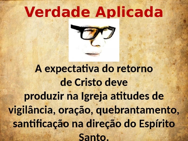 - Verdade AplicadaA expectativa do retorno de Cristo deve produzir na Igreja atitudes de vigilância, oração, quebrantamento, santificação na direção do Espírito Santo.