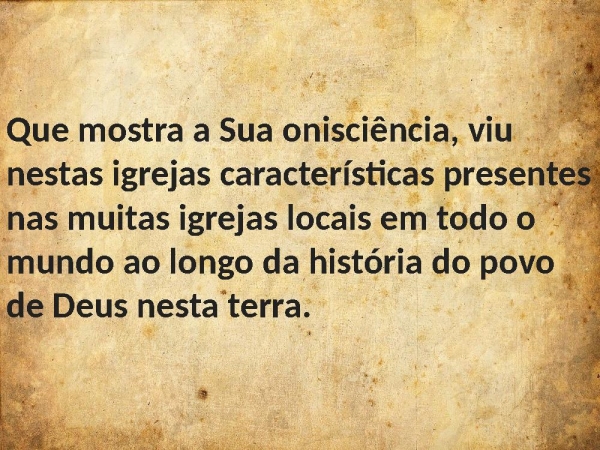 - Que mostra a Sua onisciência, viu nestas igrejas características presentes nas muitas igrejas locais em todo o mundo ao longo da história do povo de Deus nesta terra.