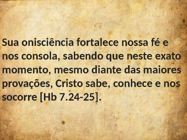 - Sua onisciência fortalece nossa fé e nos consola, sabendo que neste exato momento, mesmo diante das maiores provações, Cristo sabe, conhece e nos socorre [Hb 7.24-25].