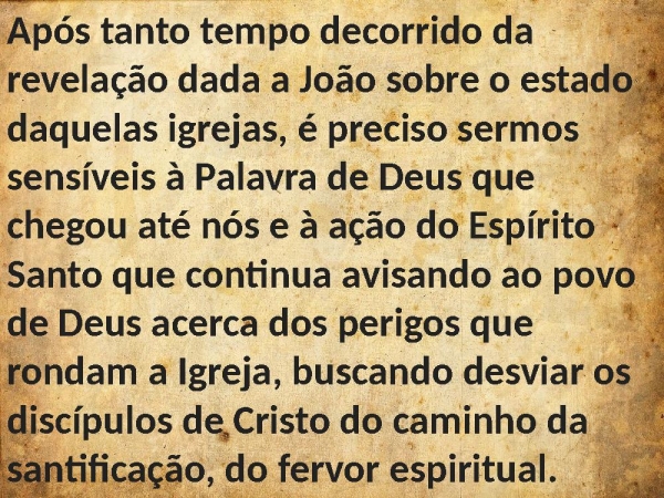 - Após tanto tempo decorrido da revelação dada a João sobre o estado daquelas igrejas, é preciso sermos sensíveis à Palavra de Deus que chegou até nós e à ação do Espírito Santo que continua avisando ao povo de Deus acerca dos perigos que rondam a Igreja, buscando desviar os discípulos de Cristo do caminho da santificação, do fervor espiritual.