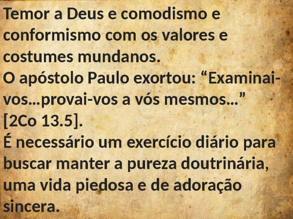 - Temor a Deus e comodismo e conformismo com os valores e costumes mundanos.O apóstolo Paulo exortou: “Examinai-vos…provai-vos a vós mesmos…” [2Co 13.5]. É necessário um exercício diário para buscar manter a pureza doutrinária, uma vida piedosa e de adoração sincera.