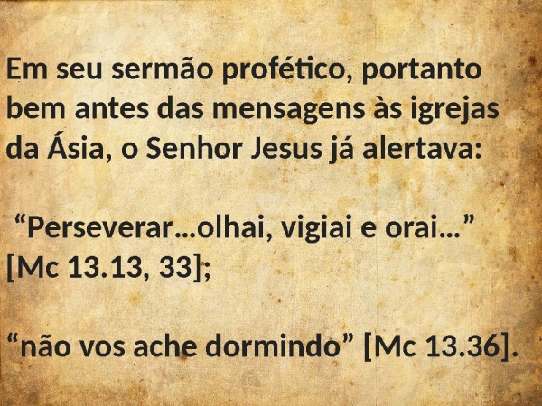 - Em seu sermão profético, portanto bem antes das mensagens às igrejas da Ásia, o Senhor Jesus já alertava: “Perseverar…olhai, vigiai e orai…” [Mc 13.13, 33]; “não vos ache dormindo” [Mc 13.36].