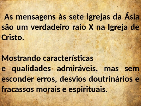 - As mensagens às sete igrejas da Ásia são um verdadeiro raio X na Igreja de Cristo.Mostrando características e qualidades admiráveis, mas sem esconder erros, desvios doutrinários e fracassos morais e espirituais.