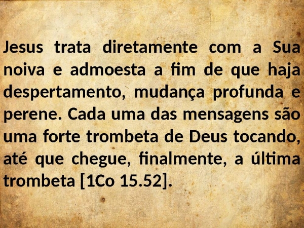 - Jesus trata diretamente com a Sua noiva e admoesta a fim de que haja despertamento, mudança profunda e perene. Cada uma das mensagens são uma forte trombeta de Deus tocando, até que chegue, finalmente, a última trombeta [1Co 15.52].