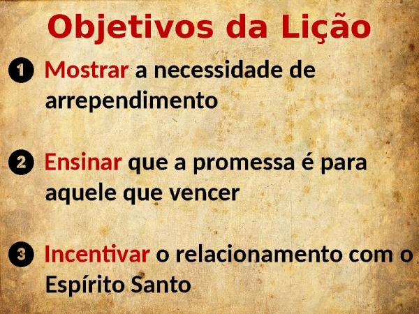 - Objetivos da Lição❶ Mostrar a necessidade de arrependimento❷ Ensinar que a promessa é para aquele que vencer❸ Incentivar o relacionamento com o Espírito Santo