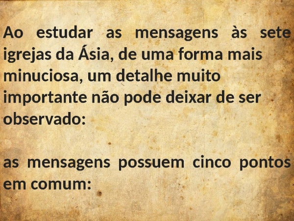 - Ao estudar as mensagens às sete igrejas da Ásia, de uma forma mais minuciosa, um detalhe muito importante não pode deixar de ser observado:as mensagens possuem cinco pontos em comum: